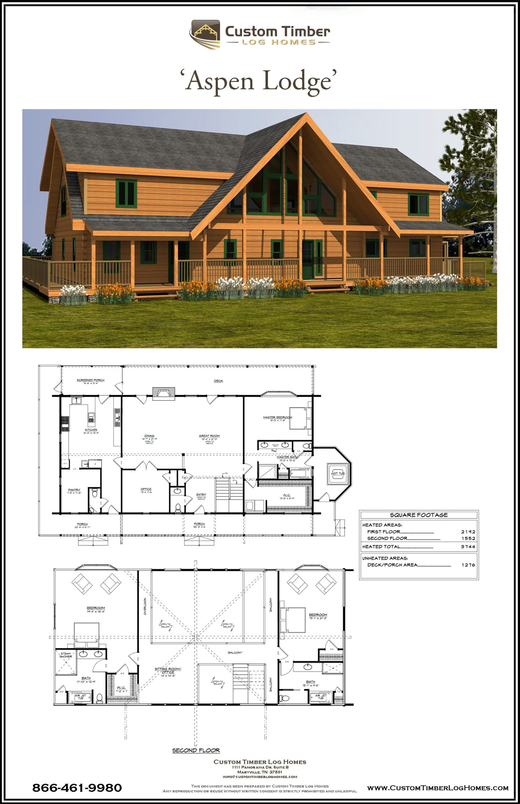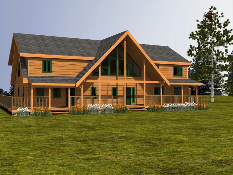 The Aspen Lodge Log Home has 3,744 square feet. The master suite is on the main level with it’s own private bathroom with dual vanities and a large walk-in closet. It also has a deck off of the master suite that would be perfect for a hot tub. This is a home meant to be lived in, with plenty of space for company. It has a large open great room with a fireplace, three full suites on two levels. It has an office just off the great room. You can easily add a basement for an extra 2,192 square feet. It also boasts a large pantry in the kitchen.